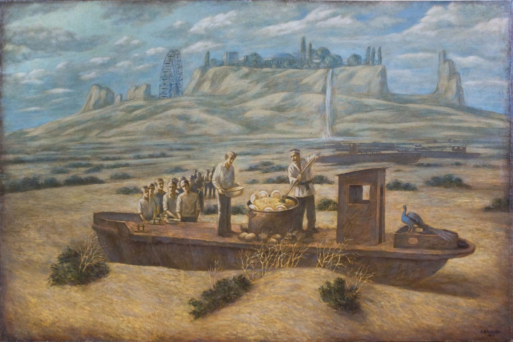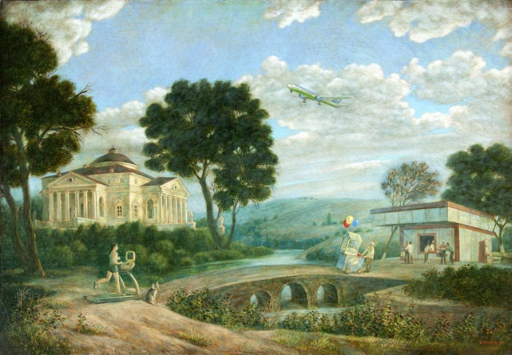 As a result of these searches from picture to picture, A.Nikolaev came to create the original version of the painting, similar in concept to the film, that is, conceived according to the laws of a performance with its own internal drama. The painting is of landscape composition built according to the canons of classical painting. At first glance they are reminiscent of the pastoral or idyllic views of some of Arcadia. However, the artist in the structure of the work is being implemented specific meaning, story mission. Heroes, characters, scenes endowed with certain roles, as if they are convened for collective action. All this is aimed at creating a kind of game, offering the viewer to invent a libretto, compose your epilogue, to participate in the “screening” of the paintings of the artist.They shaped the language and content are revealed through the play of meanings with the use of sustainable, well-established in the minds of people, of diverse archetypes of modernity.